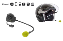 • Dispositivo Bluetooth® totalmente integrado dentro del casco. • 2 altavoces. • Escucha música en alta definición y sigue las instrucciones del GPS. • Puerto de carga USB integrado en el micrófono. • Listo para conectar con cualquier teléfono con Bluetooth®. • Conexión Múltiple: conecta dos teléfonos a la vez. • Función de conexión Dual: soporta otra conexión Bluetooth® además del teléfono. • Sistema electrónico miniaturizado y compacto integrado en los auriculares. • Botón intuitivo ubicado en el micrófono. • Un solo botón LED, rojo o azul, integrado en el micrófono. • Respuesta automática por voz. • Fácil de instalar.