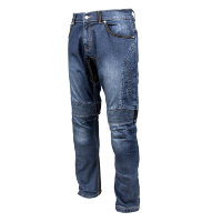 Jeans técnico que ofrece la mejor protección en caso de caída gracias a un forro en fibra aramida DuPont ® en la zona de contacto con el terreno. Esto lo rinde resistente a la tracción, a las abrasiones y al calor. Poniendo atención a vestibilidad y confort en su línea boot cut con fuelle en las rodillas y el uso de tejido elástico en el giro interior de la pierna, detrás de las rodillas y en la zona lumbar posterior. Dotado de protecciones extraíbles homologadas CE a normativa EN 1621-1:2012 de 1º nivel en las rodillas, regulables en altura, y de refuerzos foam en las caderas.